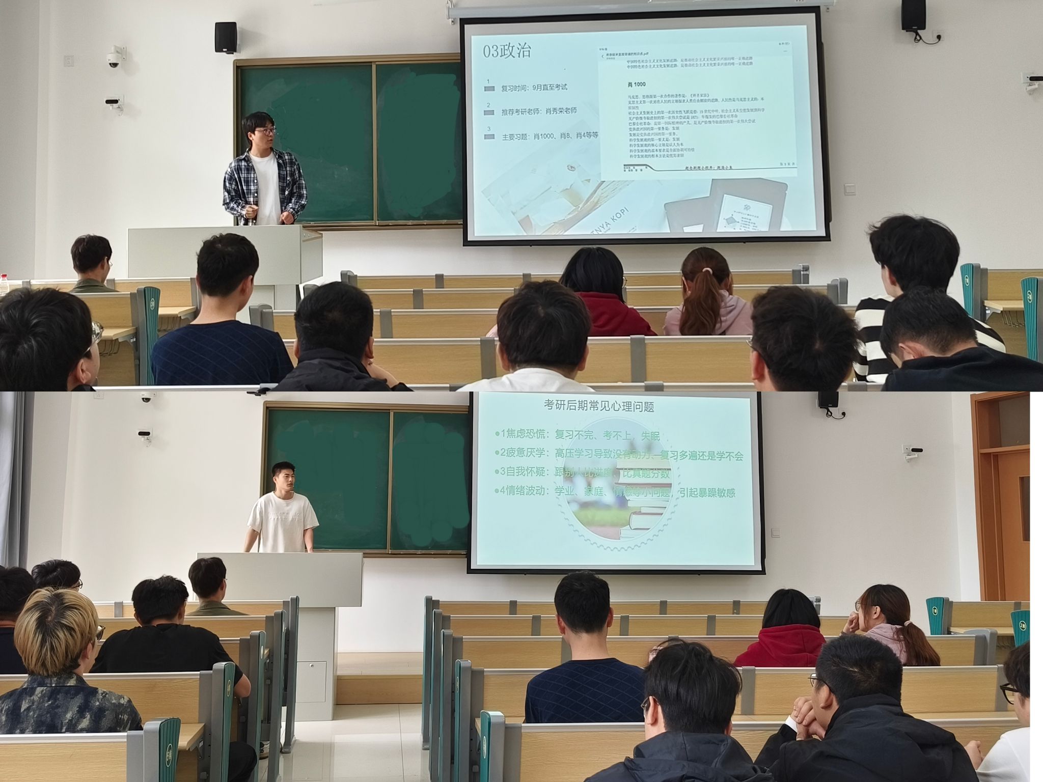 优秀考研学子们就考研科目复习进行了介绍,从复习科目教师选择、教辅资料选择、时间安排、复习节奏把控、提分技巧等几个层面展开讲解,并就考研就业两手准备、求职问题、考研后期心理健康调适进行详细说明。