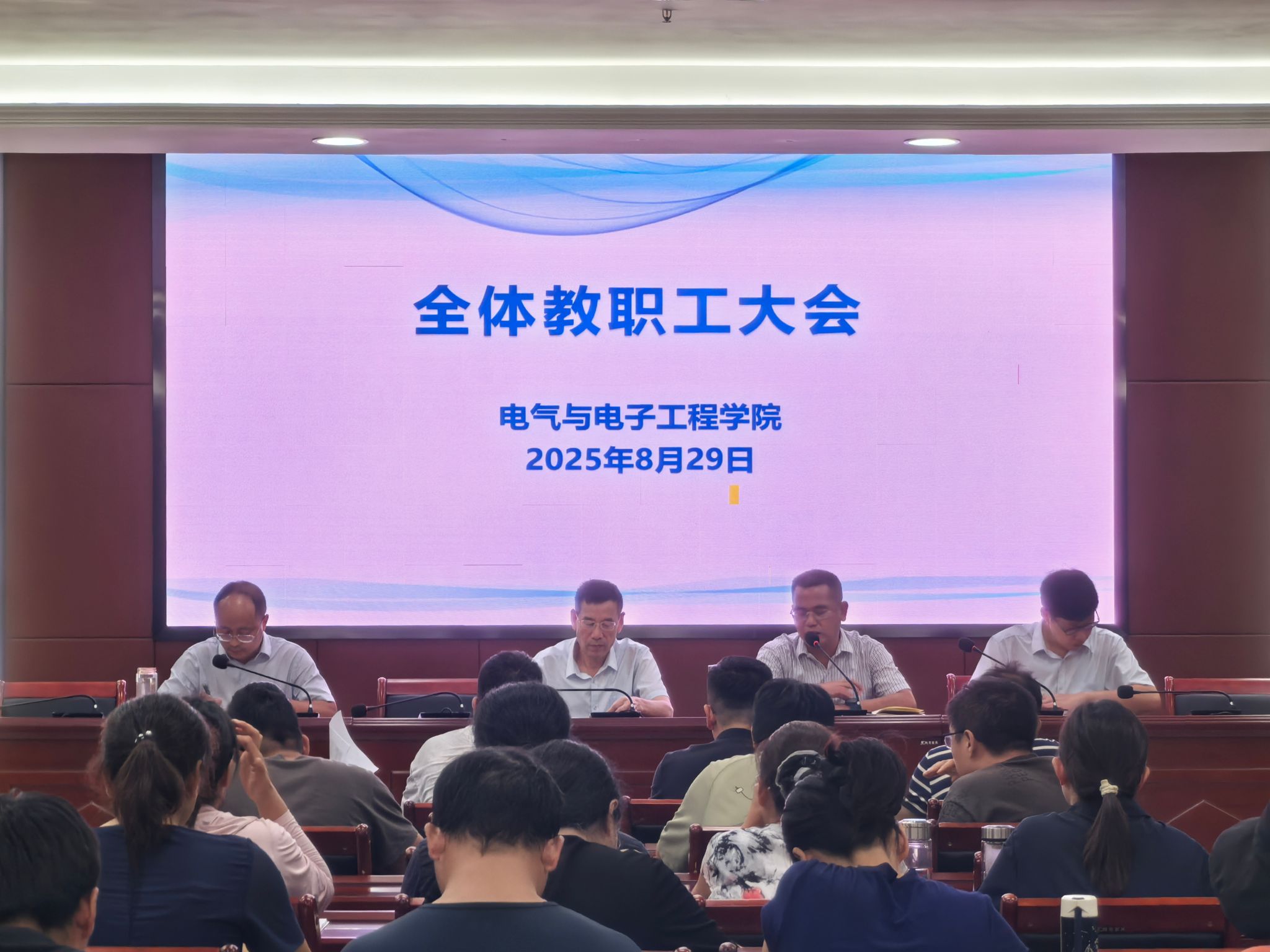 8月29日下午,电气与电子工程学院在西辅楼111会议室召开全体教职工大会。学院党委书记骆海邦,党委副书记、院长夏显明,党委副书记尚磊,副院长樊晓宇及全体教职工参加了会议,会议由骆海邦主持。