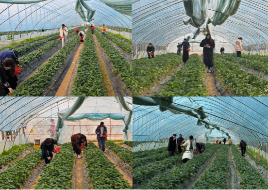 下午三时,老师们抵达乡村草莓种植基地,整齐排列的草莓大棚内生机盎然,鲜红饱满的草莓挂满枝丫。在种植户的引导下,老师们手提果篮,穿梭于田垄之间,一边采摘,一边了解草莓品种特性、种植技术及乡村特色农业发展情况。通过实地走访,大家切身感受到乡村振兴战略实施以来农村产业发展和村容村貌的可喜变化。