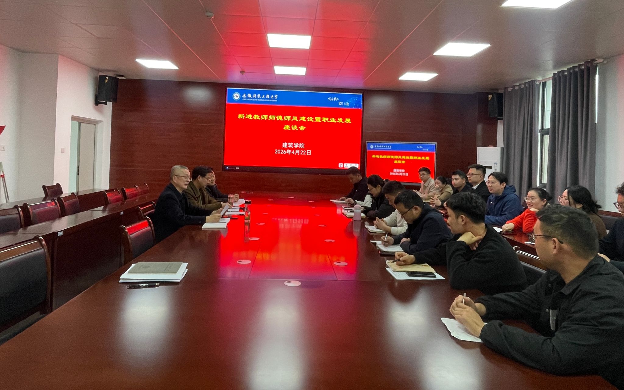 为深入贯彻落实习近平总书记关于教育的重要论述,引导新进教师树立崇高的职业理想,严守师德底线,明确职业发展方向,建筑学院于4月22日下午在尚行楼A301会议室召开新进教师师德师风建设暨职业发展座谈会。学院领导班子成员、近五年新入职教师及党政办主任参加会议,会议由学院党委书记王振其主持。