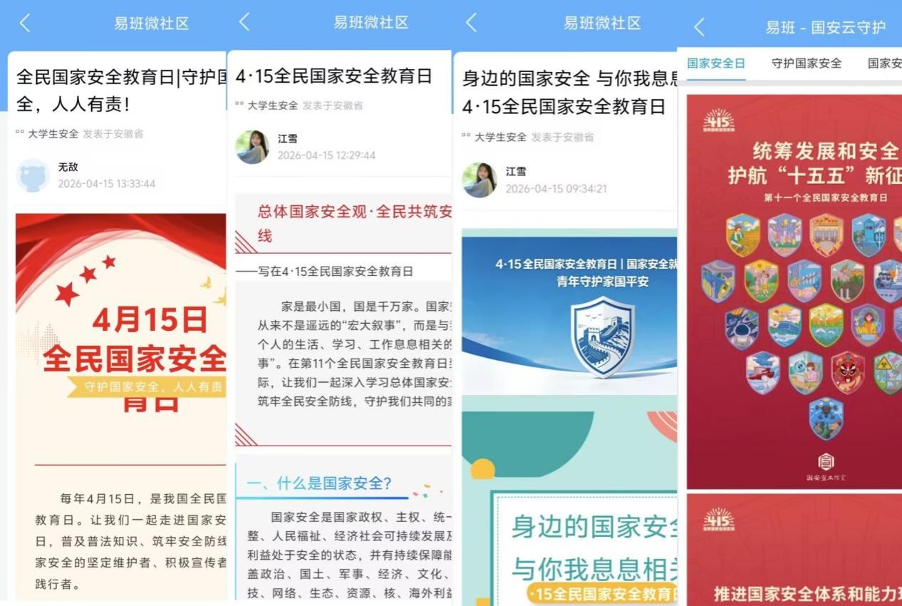 学院通过线上平台全方位构建宣传教育矩阵,多措并举拓宽教育覆盖面。一方面,组织全院学生积极参与中国大学生在线集中开展的国家安全知识线上答题活动,明确要求全员参与、认真作答,切实提升安全素养。另一方面,依托易班平台打造线上宣传阵地,精心推送3篇国家安全日系列推文,系统解读国家安全知识、宣传活动动态;搭建1个主题轻应用,整合答题入口、知识科普、活动回顾等内容,为学生提供便捷的学习渠道;制作发布1条抖音短视频,以生动形象、通俗易懂的形式普及国家安全常识,吸引学生主动关注、转发传播,进一步扩大宣传影响力。