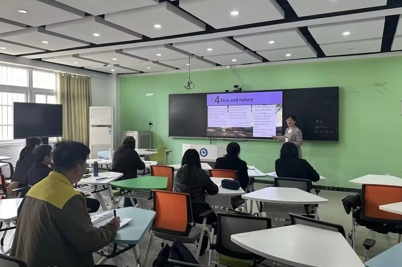 王茹茹以《新视野大学英语》第四册第四单元“Man and Nature”为主题,融合运用启发式提问、沉浸式视频赏析、小组研讨交流、图文案例对照分析等多元教学手段,引导学生深入理解“天人合一”“万物各得其和以生”等中华优秀传统文化理念,并结合全球环境问题,增强学生的生态责任意识与可持续发展观念。