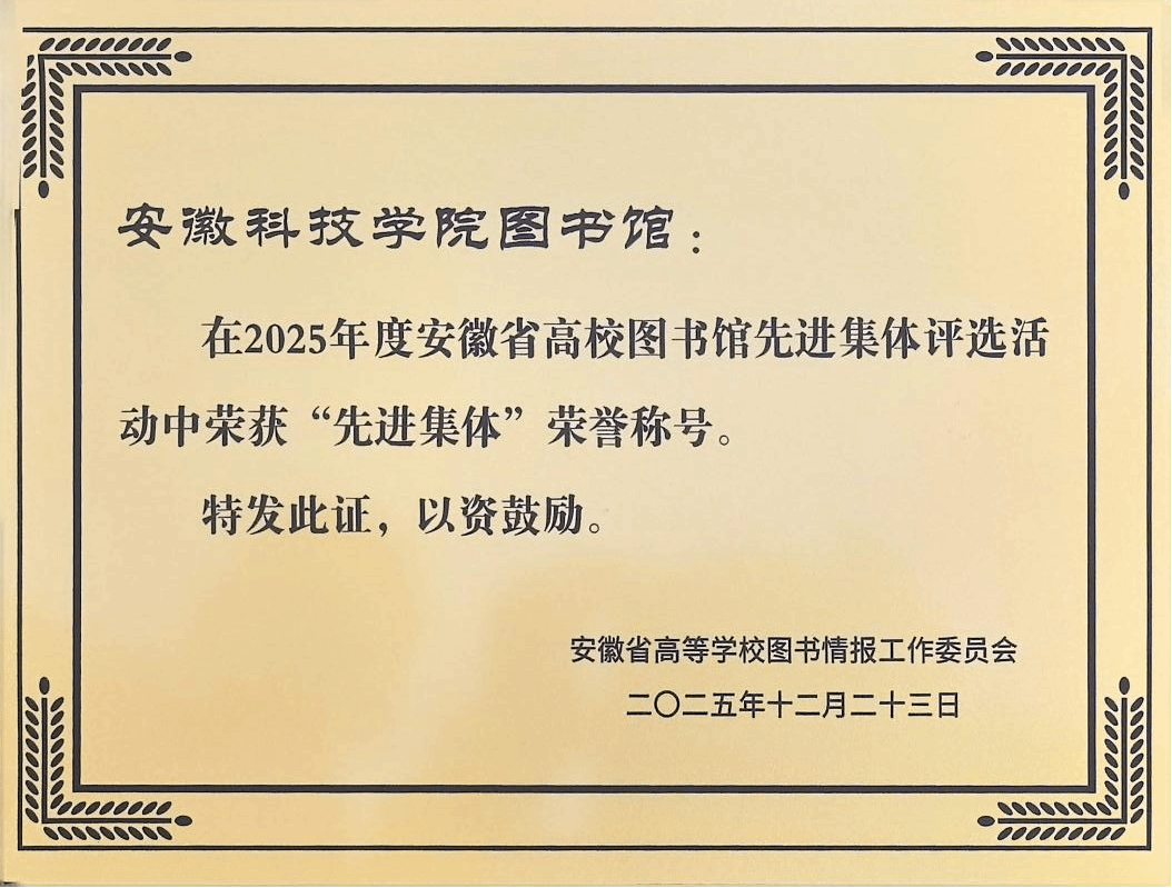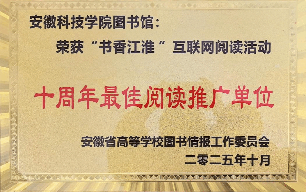 2026年1月8-9日,由安徽省高等学校图书情报工作委员会主办的2025年安徽省高校图书馆馆长年会在宿州市召开。会上,对2025年度安徽省高校图书馆先进集体和先进个人进行表彰,我校图书馆凭借在智慧化图书馆、文化赋能、社会服务、资源建设等方面的扎实成效,获评安徽省高校图书馆“先进集体”,馆员刘淑婧荣获“先进工作者”称号。此外,我馆在“书香江淮”互联网阅读活动中表现优异,获评“十周年最佳阅读推广单位”。