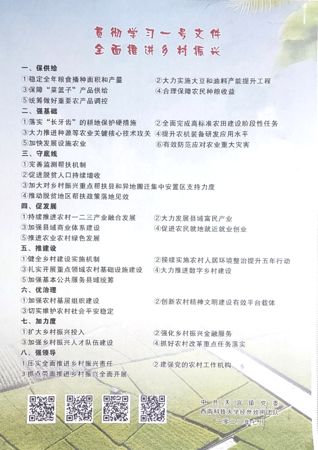 为引领广大农科学子深入学习贯彻习近平总书记对涉农高校、农科学子的深切寄语,国情民情,厚植“一懂两爱”情怀,发挥高校大学生科技志愿服务的力量,通过社会实践坚定理想信念、助力乡村振兴。2022年的暑期,西南科技大学经世致用实践团五龙小队前往四川省阆中市五龙村开展社会实践与调研,助力美丽五龙建设。