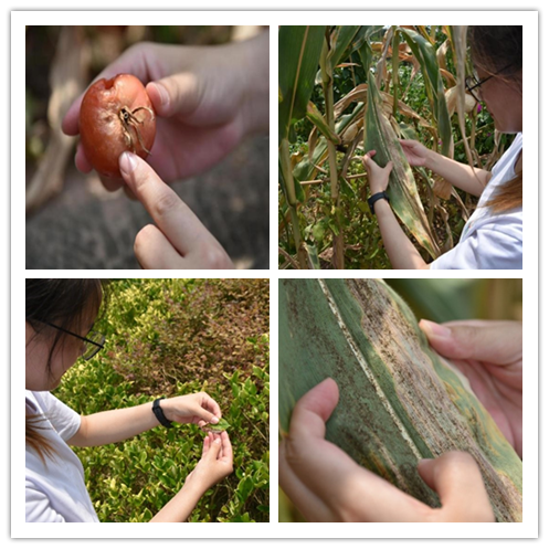 在走访调研过程中,团队注重从多角度观察五龙村农业发展,如种养种类、种养规模、种养效益、政策支持、农业人力结构、作物(牲口)病害等方面进行观察了解。同时,小队中农学专业队员在田间地头观察到当地村民种植的多种农作物健康问题,利用所学农业技术知识和理论,为村民讲解了关于玉米、大豆、番茄等当地常见农作物病害的特性、如何防治的要点和一些关于病虫害处理的小技巧。借此机会,成员们还运用手机等媒体为当地村民播放了多个科普视频,加深在场人员对维护农作物健康的了解,鼓励他们坚定从事粮食生产、助力粮食安全的信念。