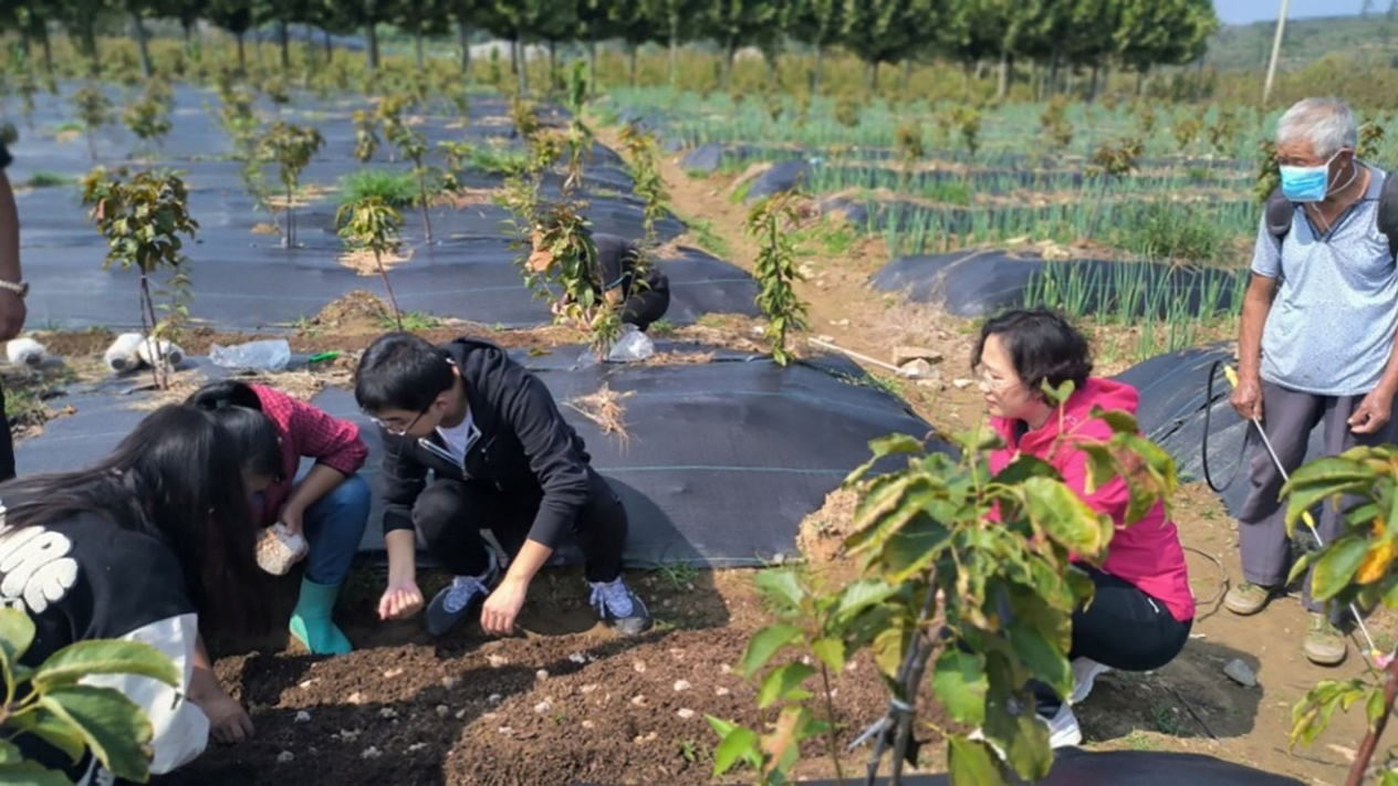 自2019年起,服务队与烟台市莱山区张格庄镇建立联系,帮助农民在果园下种植大球盖菇。在党支部领办合作社的支持下,利用果园闲置期种植稀有食用菌种趟出一条产业转型发展的新路子,将食用菌产业与我市农业优势产业—水果产业相结合,将助力我市农业产业结构调整。