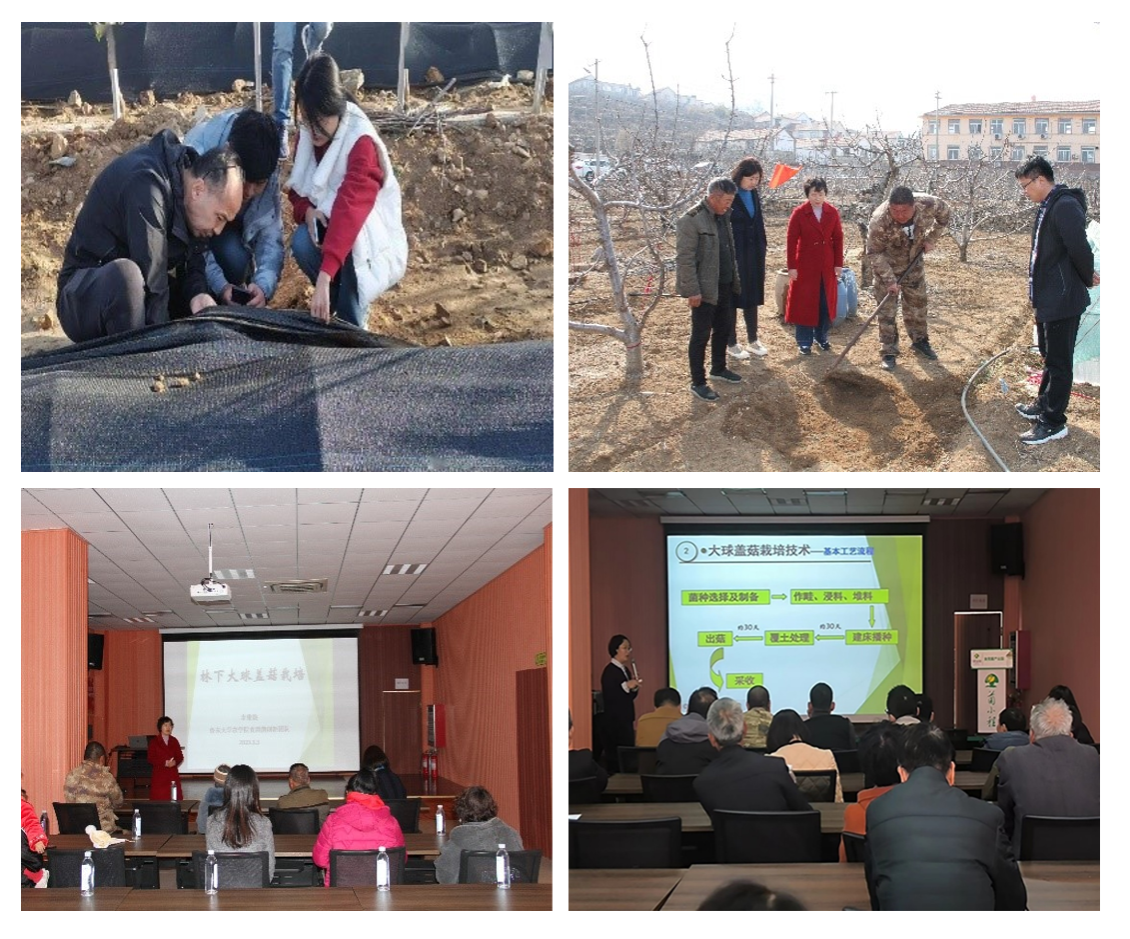大球盖菇菌丝抗逆性强,对原料要求不严格,栽培管理粗放,可进行林下栽培。于是团队创新性的提出了在果园闲置期,利用果木屑和枝条作为原料,开展果园林下栽培大球盖菇模式。建立了“果菇结合”、“以菌助农”的新产业模式,并积极探索推广,鲁东大学食用菌系的教师开始带领研究生们为助力乡村产业振兴开展一系列志愿服务活动。