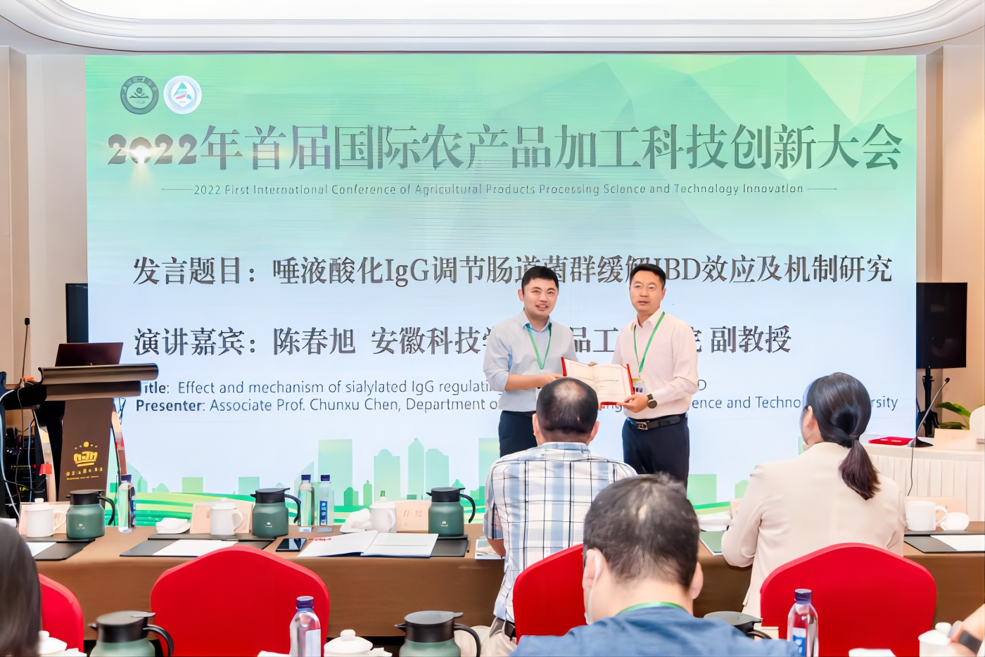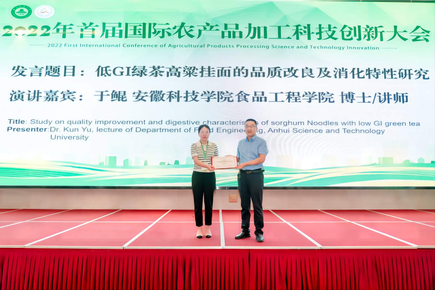 Recently, the "2022 First International Conference on Technological Innovation of Agricultural Products Processing" was held in Hefei, Associate Professor Chen Chunxu, Dr. Wei Lanlan and Dr. Yu Kun from Anhui Science and Technology University were invited to give three reports: “On the Effect and Mechanism of Sialylated IgG Regulating Intestinal Flora to Alleviate IBD”,” The Application of Functional Composite Nanofibers in Food Safety Detection” and “Preservation, and the Quality improvement and Digestive Characteristics of low GI Green Tea Sorghum Vermicelli”. In-depth exchanges were made on the research progress and trends of agricultural product storage and processing technology at home and abroad, the display of new achievements and the docking of the whole industrial chain, and the development of agricultural product processing industry was sought together. (Wei Zhaohui, School of Food Engineering)