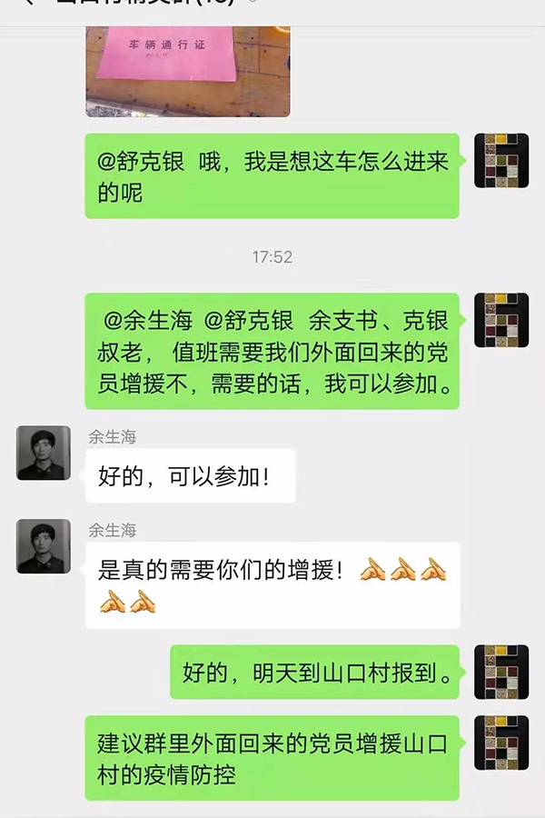 人物一:共产党员、教授舒英杰。舒英杰博士不忘自己作为一个共产党员的初心和使命,积极响应学校号召,主动参与湖北当地疫情防控工作。面对老家严重的疫情,舒英杰同志密切关注当地疫情发展情况,多次主动联系所在村(湖北省阳新县白少镇山口村)村委会,为当地疫情防控出谋划策。除夕当天下午,在感觉到疫情的严重性后,舒英杰同志主动通过电话和微信与当地村党支部书记和村委会主任联系,建议取消当地除夕夜聚众敲锣打鼓的习俗;大年初一,舒英杰同志又建议并协助村委会组织全村封路,严控车辆出入。随后几天,舒英杰同志多次在本村微信群倡议全村返乡回家过春节的党员积极投身疫情防控一线,为家乡疫情防控多做贡献。2月2日,悉闻该村口罩存在大量缺口后,舒英杰同志主动联系省外和国外的同学帮忙联系购买口罩和消毒用品。2月4日,舒英杰同志再次在本村微信群号召返乡党员同志协助村委会到村口疫情防控点值班,并于2月5日第一个来到当地村口疫情防控检查点,协助村两委参与疫情防控检查工作,耐心劝返进出检查口人员,并根据空余时间了解的疫情常识,针对新冠肺炎疫情防范进行科学宣传,耐心讲解减少人员流动的重要性。舒英杰同志的这种主动请缨参与家乡疫情防控的行为,得到当地镇政府的高度赞扬,白沙镇长在镇政府工作群通报表扬了舒英杰同志,并要求其他村学习山口村的做法。在舒英杰同志的感召下,白沙镇越来越多返乡过春节的党员纷纷投身家乡的疫情防控工作一线。