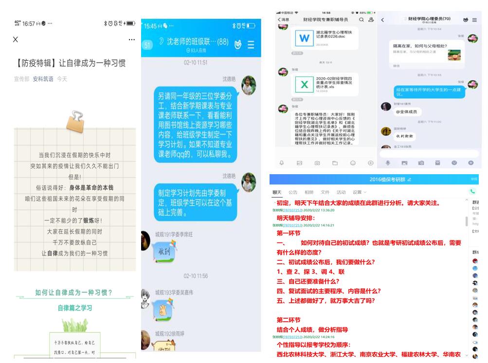 农学院辅导员张轶辉老师紧密结合学生最喜欢用QQ聊天交流的实际,充分挖掘QQ群的功能,利用QQ群公告开展就业信息发布、学生思想政治教育,利用QQ群开展考研复试面试指导、辅导,利用QQ群作业功能给学生布置作业,督促学生防疫学习两不误。疫情期间,广大辅导员积极整合各类资源,充分利用网络技术,构建网格化、层级化、微信化的工作模式,建立了2020年就业工作群和2020年考研交流群,全力向毕业生推送就业信息和考研信息,做好学生的答疑解惑工作;积极联系相关企业,召开空中网络招聘会,同时及时把各高校的考研调剂信息推送给有需要的学生,有的放矢地指导学生们进行求职和考研工作,把疫情对毕业生就业和考研的影响控制在最小限度。 建筑学院辅导员沈德艳老师在所带学生干部群发动学习委员结合新学期课表和学校提供的《疫情防控期间向社会公众免费开放的部分数据库列表》,联系专业课老师,制定班级学习计划,“停课不停学”,帮助学生开启自律生活。外国语学院每名论文指导教师都建立毕业论文指导工作群,对毕业生论文写作进行指导。外国语学院辅导员陈慧中利用网络进行就业教育,在线上联系企业发布精准就业推荐公告、利用班级学生党员成立就业提升小战队、制作就业提升小课堂、一对一在线简历修改,缓解同学们就业顾虑与压力。动物科学学院辅导员李焱老师指导毕业生考研复试和调剂,主动联系校内外考研资讯和资源,积极鼓励和引导考生做好复试、调剂准备,给予学生考研及择优个性化指导。