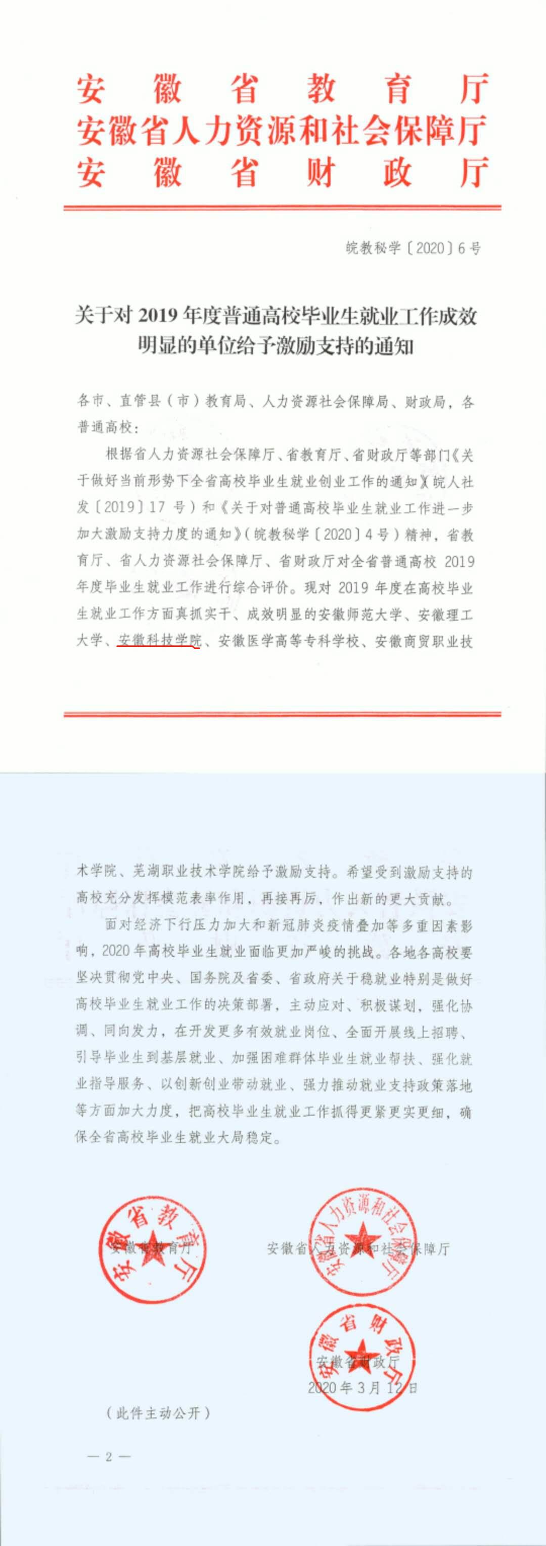 日前,根据《安徽省教育厅安徽省人力资源社会保障厅安徽省财政厅关于对2019年度普通高校毕业生就业工作成效明显的单位给予激励支持力度的通知》(皖教秘学〔2020〕6号)文件精神,经省教育厅、省人力资源社会保障厅、省财政厅组织专家评审,我校荣获2019年度毕业生就业工作成效突出单位荣誉称号,本次全省共激励表彰高校6所,其中本科3所,专科(高职)3所。