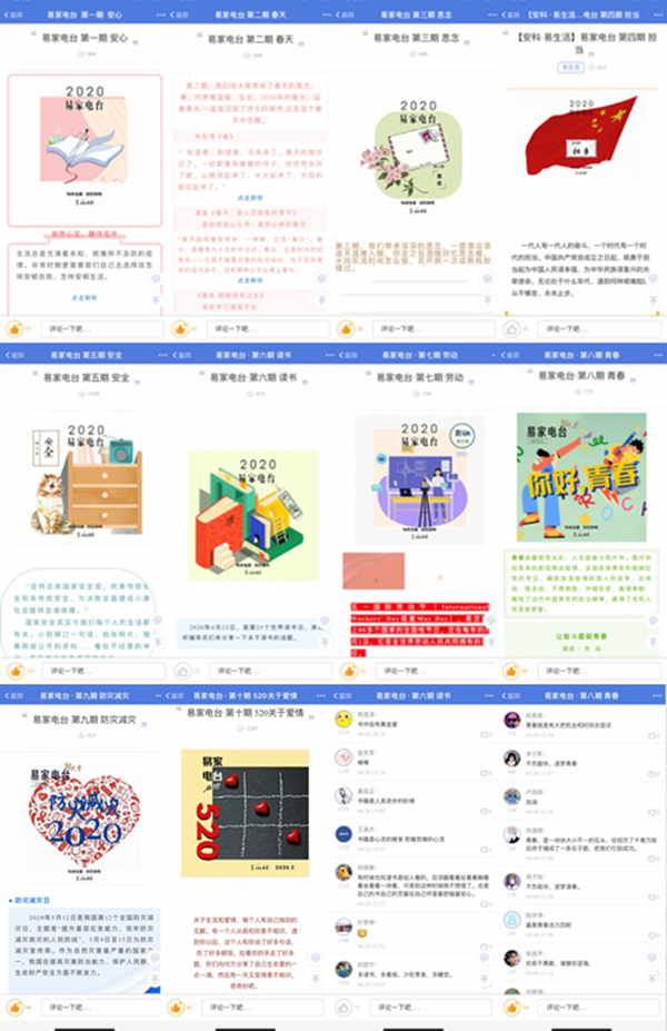 疫情发生以来,我校积极创新网络思政教育方式,利用易班平台,打造特色“易家电台”思政专栏,辅导员积极“发声”,通过易家电台以诵读经典音频分享个人感悟开展思想引领、网络辅导、舒缓心灵等工作。3月初首期以“安心”为主题开讲,《疫情中恰到好处的孤单》《安然心定,静待花开》《少年强则中国强》等文章向同学们传递科学防护知识,帮助大家增强战胜疫情的信心。随后每周定时更新,第二期“春天”为主题分享《春天,是心灵放牧的季节》《春来困顿终将过去》《望春风》等文章,引导同学们不要荒废宅家时光,关注祖国春光,彼此分享这段特殊时光的美好故事。第三期主题“思念”,分享原创文章《在春风里等你们归来》以及《奶奶的星》《背影》等名篇节选,一起回忆曾经温暖美好愉快的时光。第四期主题“担当”分享原创文章《青春,一场远行》以及《勇于担当甘于奉献——凝聚抗击疫情的精神力》《90后,00后,用青春能量勇往直前》时评激励同学们无论什么时候、遇到何种艰难险阻都要不懈怠、勇奋斗,担当起青年一代的责任。第五期正值全民国家安全教育日,以“安全”为主题,分享《涵养国家安全意识贵在深入重在持久》《大学生应树立怎样的安全意识》等,教育同学们国家安全其实与我们每个人的生活都有关,要从身边小事做起维护国家安全。第六期“读书”,《每天读书15页提高注意力》《清单:关于爱与奇想的124张小纸条》《读万卷书行万里路》等,调动同学们线上读书学习的积极性,督促大家保持自主学习习惯,提高学习质量,云端互助共学落实停课不停学。第七期正值五一国际劳动节,以“劳动”为主题,《劳动者最美,奋斗最幸福》《坚持一定很酷》《劳动创造辉煌》,勉励青年学生树立劳动光荣、创造伟大,以辛勤劳动为荣、以好逸恶劳为耻的正确劳动观。第八期“青春”,分享《青春》《让奋斗磨砺青春》《让青春枝头绽放绚丽之花》,鼓励大学生们正处在人生最美好的时光,青春由磨砺而出彩,人生因奋斗而升华。第九期“防灾减灾”为主题,在防灾减灾宣传周分享《防灾减灾日——人人可为人人能为人人要为》《铭记灾难莫传谣言》《关于地震自救你要知道这些》等,分享在灾害发生时的自救常识,提高同学们防灾减灾的意识和能力。第十期“520关于爱情”《爱情是什么》《余生,请和配得上你的人在一起》《致橡树》,辅导员们用朴素的话语诠释着爱情的美丽,培养大学生们进一步树立正确的爱情观。