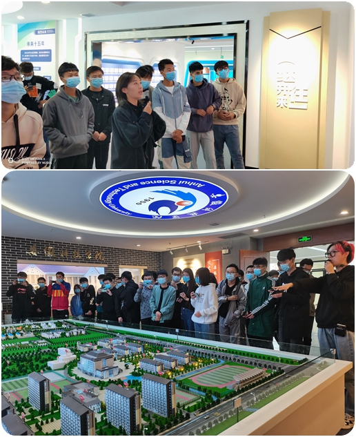 国以史为鉴,校以史明志。校史馆以实物、图片、文字、影像等展示学校历史与成就。在讲解员的带领下,同学们相继走进了“序厅”、“峥嵘岁月”、“春华秋实”、“继往开来”四个专题展区。四个专题展区深刻地呈现了我校的美好过往,再现了我校70年的风雨沧桑。70年的栉风沐雨,一代代安科人薪火相传、砥砺奋进,历经一系列的风雨变迁,成就了今天的安徽科技学院。面对我校当今所取得的一系列成就,同学们纷纷露出了自豪的微笑,并发声要为我校的不断发展竭尽全力。
