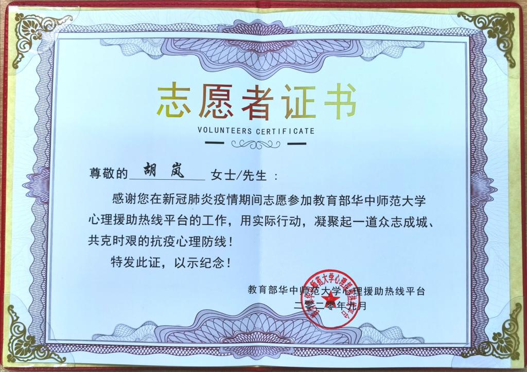 今年3月至5月,胡岚志愿参加教育部组织的武汉市华中师范大学心理援助热线平台的工作,线上为武汉市医务工作者、患者和家属、市民提供心理危机援助工作,主动接受教育部组织的线上心理危机干预技能专题培训和专业督导,并根据平台统一安排圆满完成疫情期间热线心理援助任务,为“共克时艰、加油武汉”贡献了安科人的一份力量。(特约通讯员:石志成 审核:何永勇 编辑:汤帅)