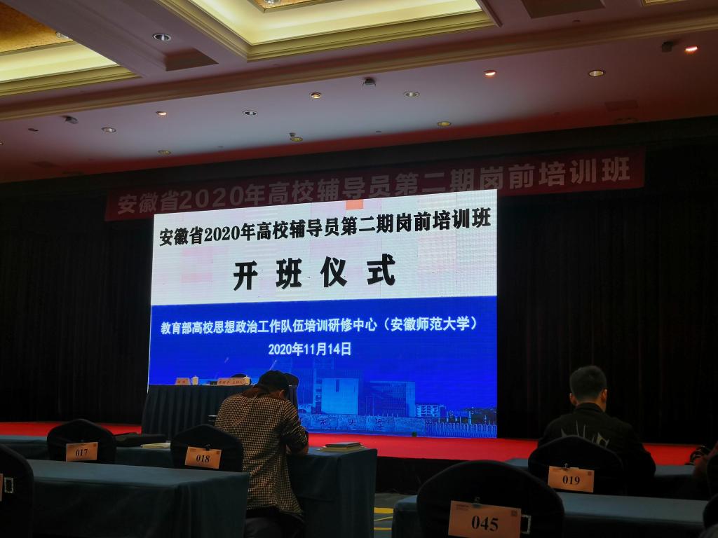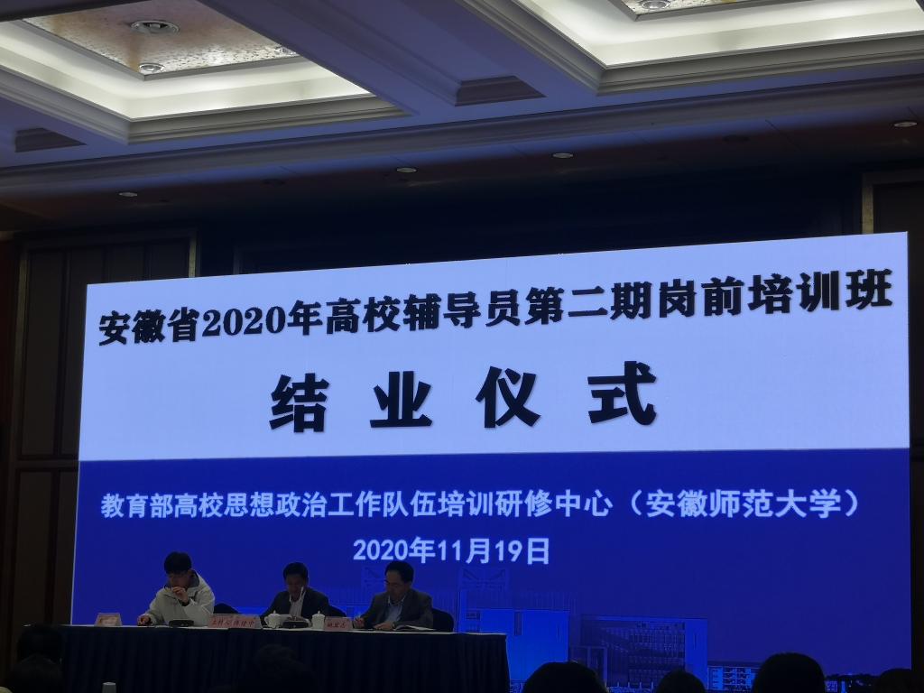 11月14日至11月19日,由中共安徽省委教育工委主办,高校思想政治工作队伍培训研修中心(安徽师范大学)承办的安徽省2020年高校辅导员第二期岗前培训在芜湖举行。我校2020年新进辅导员孟凡生、王丽萍、李振浩等3人参加培训并顺利结业。