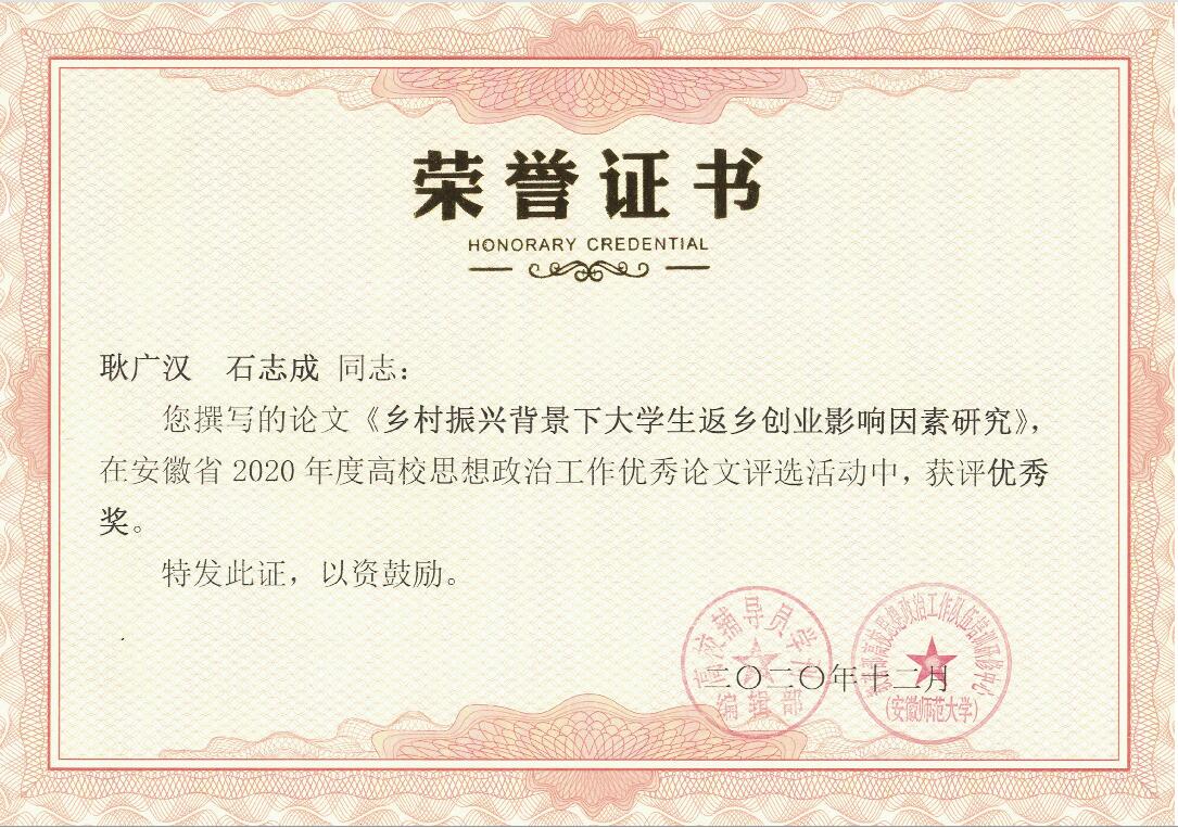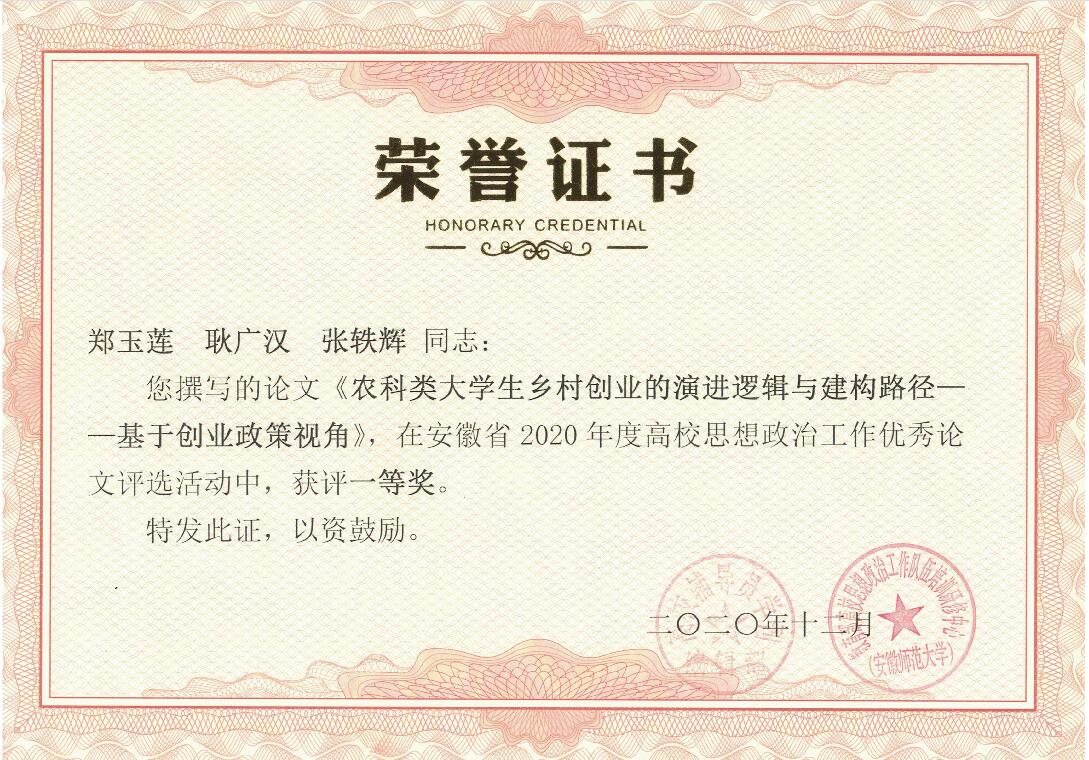 日前,安徽省2020年度高校思想政治工作优秀论文评选结果揭晓,我校农学院辅导员郑玉莲等撰写的论文《农科类大学生乡村创业的演进逻辑与建构路径——基于创业政策视角》获评一等奖,财经学院辅导员耿广汉等撰写的论文《乡村振兴背景下大学生返乡创业影响因素研究》获评优秀奖。
