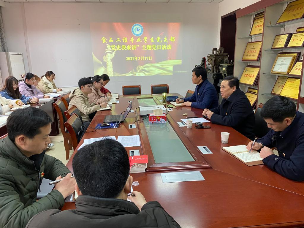 为庆祝即将到来的中国共产党百年华诞,进一步加强支部党的建设,开展党史教育,3月17日下午,校党委副书记韦文联为食品工程专业学生党支部讲授微党课,党总支书记付光玺主持会议。