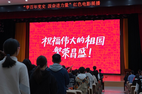 “影片让我们重温了那段国破家亡,战火连天的岁月,让我们愤恨于日军罄竹难书的累累罪行,让我们钦佩于革命先烈前仆后继的视死如归,让我们感叹于和平生活的幸福来之不易!”校学生会成员王露有感而发。影片放映结束,全体观影学子起立,唱响《我和我的祖国》,用激情点燃梦想,以歌声献礼建党百年。
