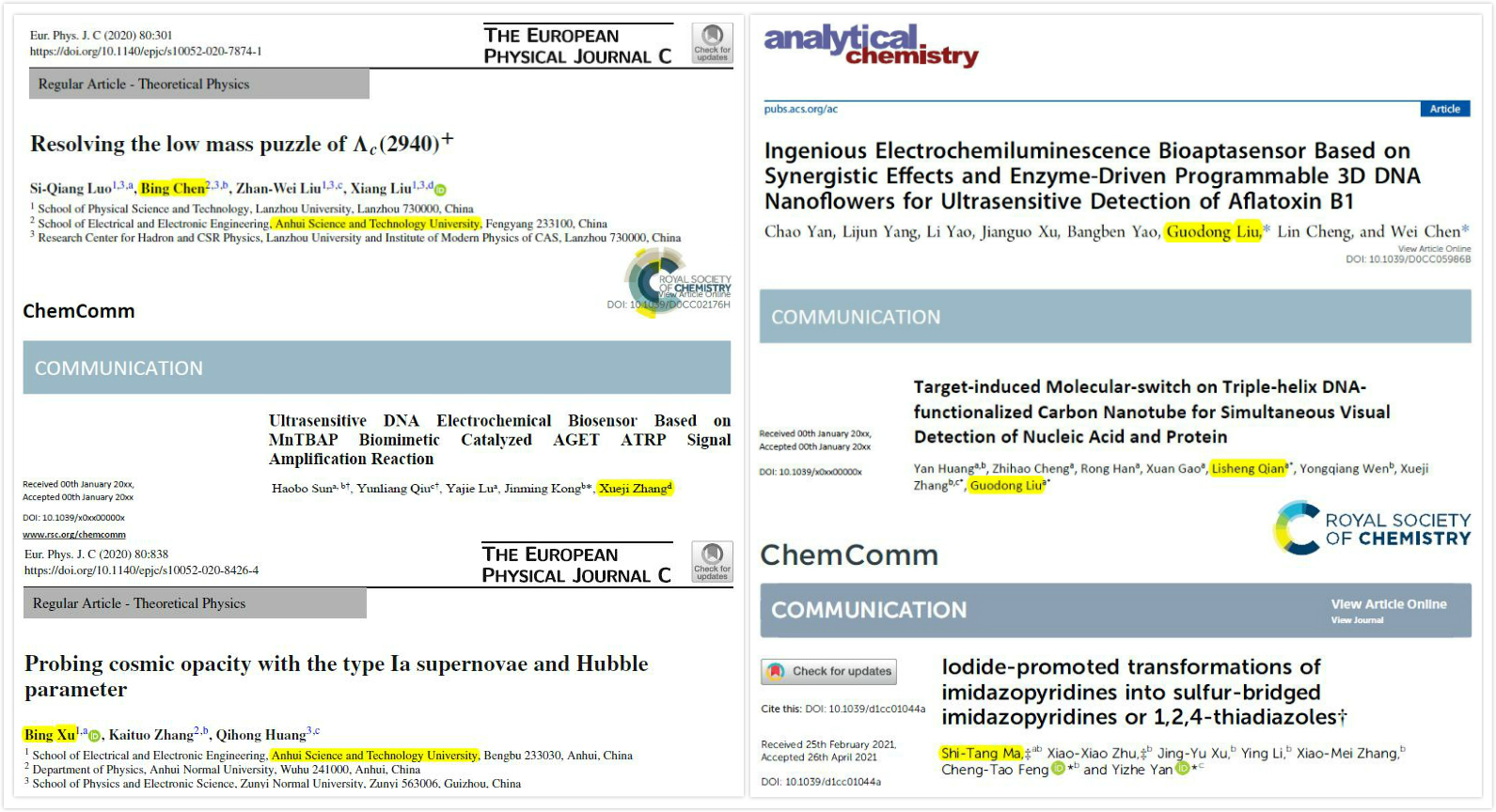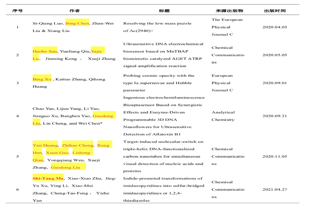 自2020年1月以来,我校教师电气与电子工程学院陈兵、徐兵,生命与健康科学研究院张学记团队、钱立生、刘国东团队,以及学报副主编马世堂等分别在The European Physical Journal C、European Physical Journal C、Analytical Chemistry以及Chemical Communications等自然指数(Nature Index)收录期刊发表6篇高水平研究论文。