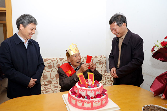 正值春意盎然、鲜花烂漫之际,我校退休教授印天寿迎来了自己的百岁寿辰。印天寿老人是学校现在最高龄的退休教师。5月21日上午,校党委书记蒋德勤、校党委副书记、校长李震、校党委副书记韦文联等一行来到印天寿老人家中看望并祝寿。离退休工作处处长时乾、农学院党委书记何世潮、院长崔广荣等陪同慰问。