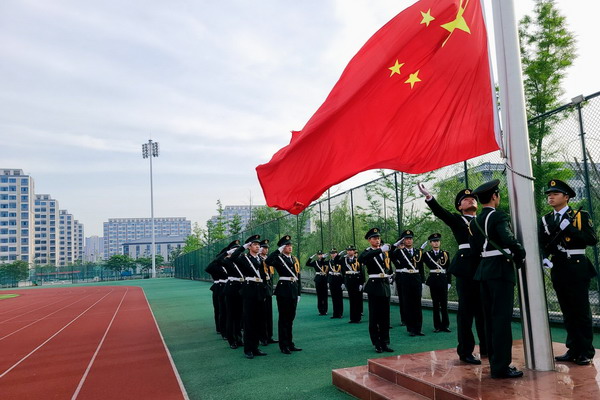 6时40分,国旗班的旗手们着装整齐,迈着矫健的步伐,护卫着鲜艳的五星红旗入场举行升旗仪式。伴着《义勇军进行曲》的响起,五星红旗冉冉升起,全体成员行注目礼,庄严肃穆。