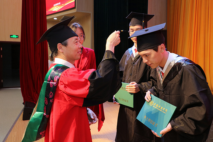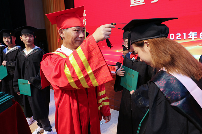 校党委副书记、校长李震为龙湖校区毕业生授予学位扶正流苏