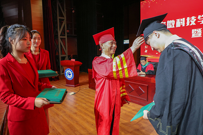 校党委副书记、校长李震为凤阳校区毕业生授予学位,扶正流苏