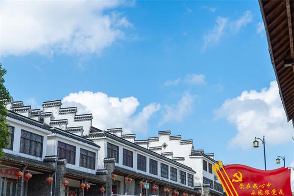 七月的太阳像烈火一样灼烧着土地,也点燃了实践团各位成员实地调研的热情。一入井亭村口,首先吸引眼球的便是沥青硬化的主干道,道路两侧种植了挺拔大气的广玉兰、精致养眼的红叶石楠等景观植物,并配备了景观路灯。进入中心区域后,就可以看到一排排古徽派建筑风格的民居。这些徽派民居高墙封闭,墙线错落有致,黑瓦白墙,色彩典雅大方,粉墙、小青瓦、马头墙、砖木石雕以及层楼叠院、高脊飞檐、亭台楼榭等和谐组合,处处彰显出一股灵气。