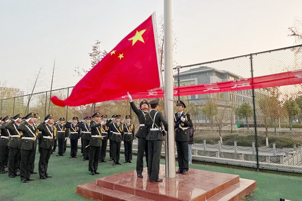 护旗手护着国旗,迈着铿锵有力、整齐划一的步伐,气氛庄严肃穆。当雄壮的《义勇军进行曲》响彻校园上空的时候,鲜艳的五星红旗伴随着国歌声冉冉升起,现场师生共唱国歌,唱出了当代中华儿女的强国决心。
