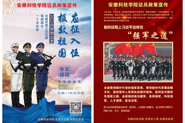 编发政策资料,夯实工作基础。学生处编印《征兵工作基本常识手册》《2022年大学毕业生直招军士报名工作指南》 等资料,各学院结合专业情况制作海报,重点宣传全国、全省和学校征兵工作部署要求,中央有关部门、安徽省、蚌埠市及各地在促进高校毕业生参军入伍、权益保障等方面出台的政策措施,我校应征入学大学生典型事迹等情况,进一步夯实了征兵工作基础。