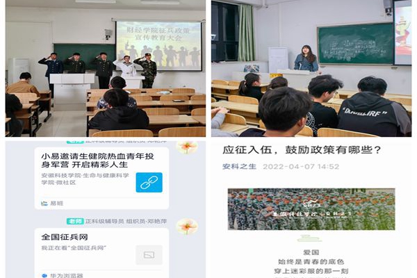 开展政策解读,做好组织动员。各学院创新工作形式,细化工作举措,发挥征兵专干、征兵联系人、退役大学生士兵的积极作用,多方位多途径开展征兵工作政策解读,做到全覆盖深推广。生命与健康科学学院党政主要负责人线上助力政策宣讲、财经学院分管书记线下主持召开宣讲会、化学与材料工程学院开展军事爱国题材电影欣赏、管理学院征兵联系人开展专题宣讲等活动,在组织动员方面起到了较好的促进作用。