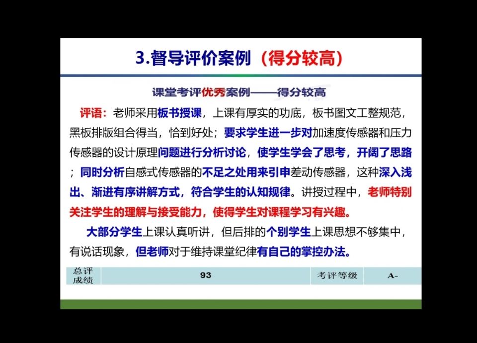 督导考核办公室主任程斌在总结点评时指出,新进青年教师明确教师是第一身份、教学是第一工作、育人是第一职责,在校院两级督导的指导帮助下,潜心学习教学理念,钻研教学方法,尽快站稳讲台;校院两级督导老师继续用心用情,以导为主,以督为辅,与青年教师形成教学成长共同体,继续客观公正的评价教师教学,为管理部门提供有价值的教学评价信息;教学院(部)能够关爱关心青年教师,帮助青年教师正确面对工作中的压力与挑战,为青年教师教学成长与发展提供好的氛围与平台。