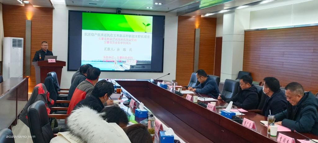 12月10日,由安徽省农业科学院牵头,我校承担的“抗逆稳产优质适机收玉米新品种新技术转化项目”历经一年,在安徽省农业科学院创新大楼二楼会议室进行结题汇报。省财政厅农业农村处主任科员梁晓天,安徽省农业科学院科研处处长李成、计财处处长刘小平,安徽科技学院农学院院长崔广荣、科研处副处长李同杰,部分项目组成员出席会议。项目验收专家组由安徽省农业科学院研究员陈洪俭、安徽省农技推广总站副站长康子领、安徽省种子管理站研究员刘玉恒、合肥丰乐种业股份有限公司正高级农艺师张二朋、众华会计师事务所商宜洲等成员组成。会议伊始李成致辞,专家组观看了课题组精心准备的视频,余海兵教授代表项目组从课题研究背景、研究目标、研究内容、研究方法、研究成果等方面做了全面细致的汇报。