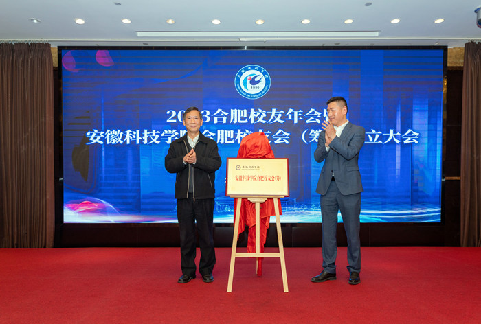 年会上,李震同合肥校友会负责人郭凯一起,共同为安徽科技学院合肥校友会(筹)揭牌,全国各地校友组织纷纷发来贺函贺电,祝贺合肥校友会(筹)成立,祝愿母校发展事业和校友事业蒸蒸日上。