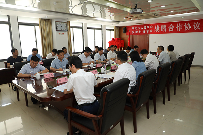 张传宗高度评价了学校近年来事业发展取得的成就。他指出,安徽科技学院是一所多学科协调发展的高校,学校长期给予明光技术人才支持,输送了大批优秀人才,相信通过双方的进一步合作,学校的学科优势、科研优势一定能转化成明光的产业优势、经济优势,并就下一步校地合作情况和合作构想作了相关说明。