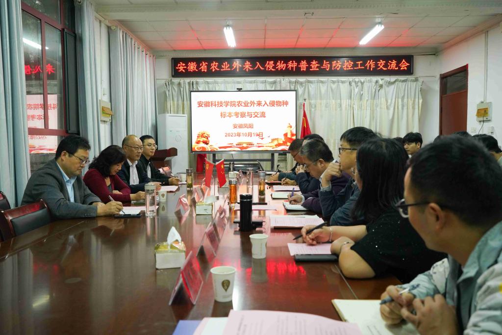 随后省农业外来入侵物种普查与防控工作交流会在农学院会议室召开,会议由何世潮主持。何世潮代表学院对各位领导专家赴校考察指导表示热烈欢迎及诚挚感谢,崔广荣和副院长李文阳分别介绍农学院整体情况和植物保护团队建设情况。殷雨虹对我校在省农业外来入侵物种普查与防控工作中所做的工作给予了高度肯定并表示感谢,希望我校在今后的省农业外来入侵物种常规监测及防控工作中继续提供强有力的技术支撑并期待开展更加全面深入地合作。何金铃高度评价了我校在省农业外来入侵物种普查中所做的工作,指出在全省农业外来入侵物种普查数据中,毕亚玲团队数据量丰富、信息记录较为完整、样地调查较规范、植物标本采集与制作优异。