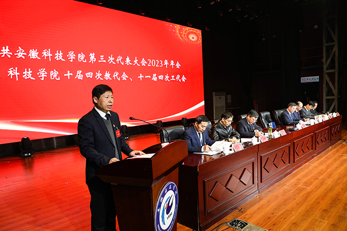 1月17日至18日,我校第三次党员代表大会2023年年会暨校十届四次教代会、十一届四次工代会在凤阳校区大学生活动中心胜利召开。校党委书记时伟,党委委员、副院长黄远友,党委委员、副院长李升和,党委委员,副院长王孝义,党委委员、机关党委书记卫胜,党委委员、党委组织部部长钱锐,党委委员、党委宣传(统战)部部长何永勇,校工会主席汪洋出席大会并在主席台就座。全体代表、列席人员和特邀人员参加大会。