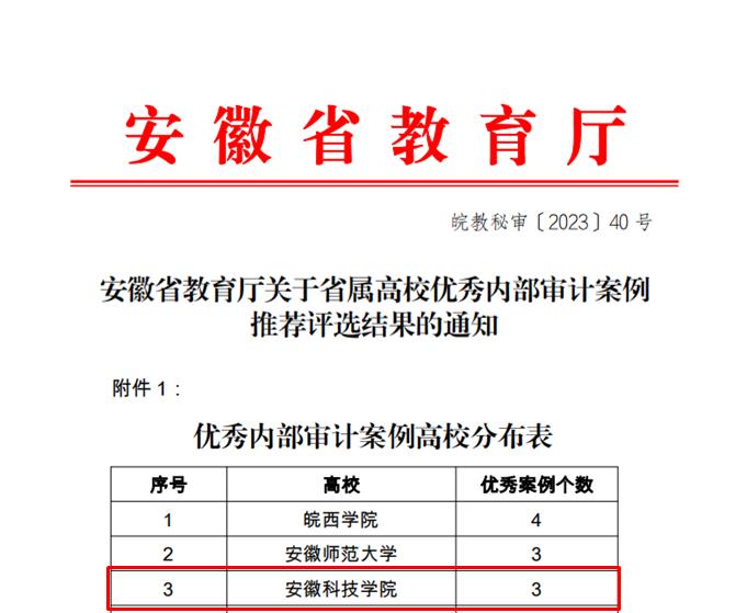 近期,安徽省教育厅印发《关于省属高校优秀内部审计案例推荐评选结果的通知》,全省36所省属高校立足学校内部审计工作实际,择优选报了经济类、管理类、工程类共计99个内部审计案例。经高校互评、专家线上评审,最终33个案例被推荐为优秀案例。我校审计处撰写申报的3个案例全部获评“省属高校优秀内部审计案例”,优秀案例数并列省属高校第二。