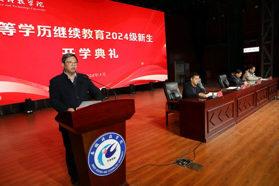 李升和代表学校致辞,他首先向2024级新生表示热烈欢迎,祝贺大家加入安徽科技学院大家庭。致辞中,他向大家介绍了安徽科技学院的办学历史、办学特色和近年来学校在人才培养和服务地发经济社会发展取得的成绩,强调了继续教育是学校事业发展的重要组成部分,学校继续教育坚持以“终身教育”为办学理念,紧扣经济社会发展需求,形成了“学历教育和非学历培训”协同发展的新模式,为经济社会发展培养了一大批高素质优秀人才。随后,他从三个方面对全体同学提出了殷切期望,希望同学们珍惜机会勤奋学习;勇于创新学有所成;克服困难学以致用。最后,他勉励同学们要传承和发扬好“艰苦奋斗、开拓创新、求真务实、无私奉献”的安科精神,把自己培养成为对社会有用的人才,不负伟大时代,不负心中梦想,用勤奋和努力去续写辉煌。