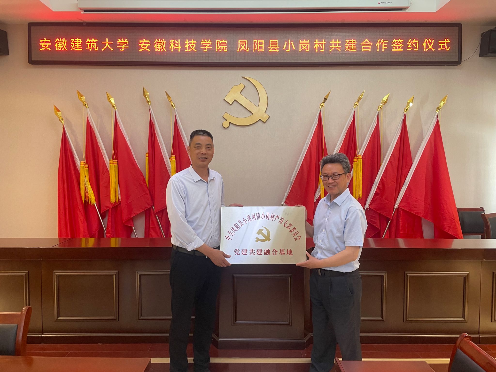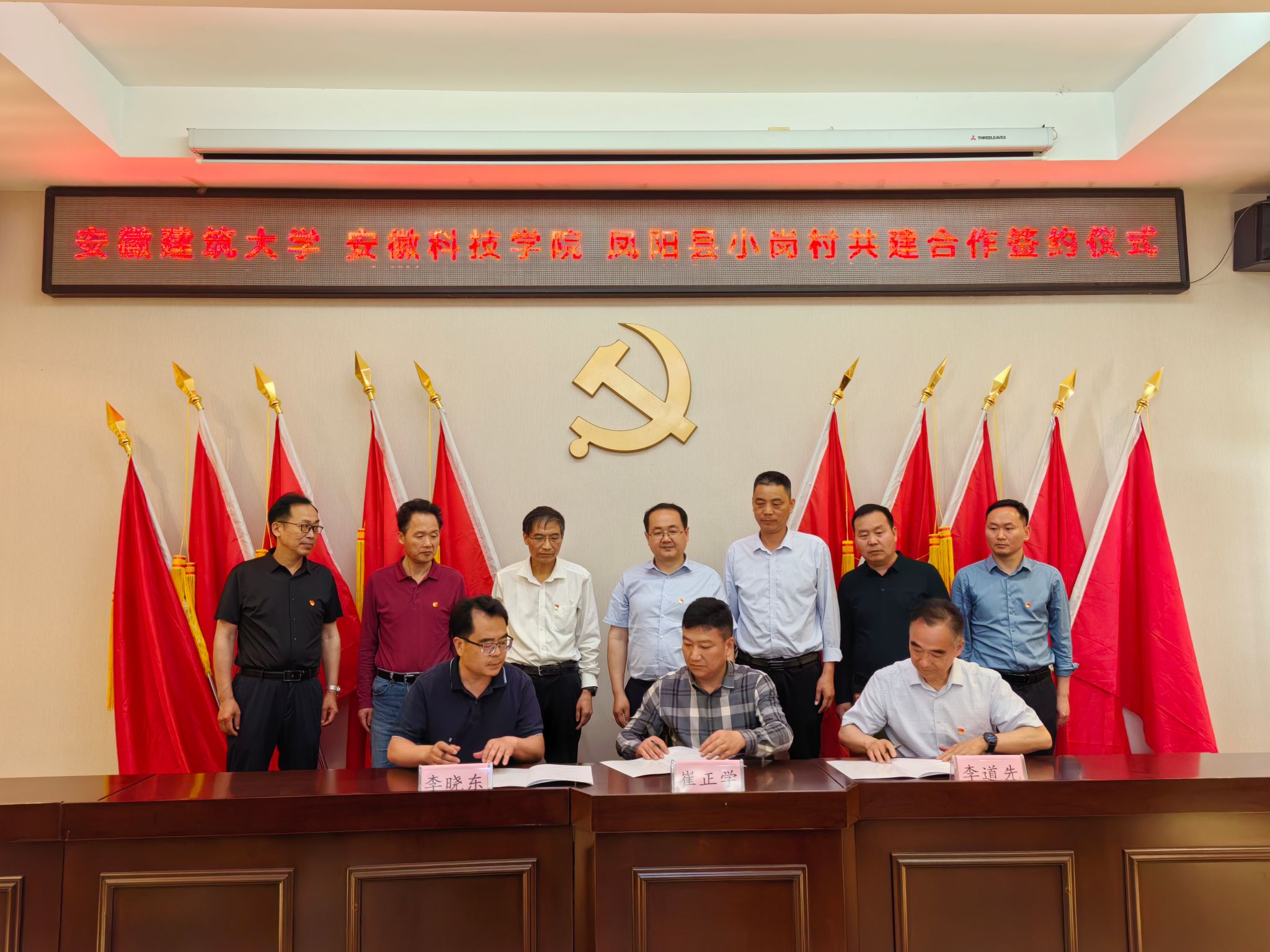 根据安徽科技学院《关于进一步深化与凤阳县小岗村战略合作助力乡村振兴实施方案》和《2024年深化与凤阳县小岗村合作推动乡村治理重点工作安排》,为充分发挥人文学院党委“全省高校党建工作标杆院系”和全省高校“双带头人”教师党支部书记工作室的引领辐射作用,深化校地全面合作,助力小岗村基层党建提质增效与融合发展,在学校与凤阳县小岗村战略合作领导小组办公室(以下简称“校小岗合作办”)和党委组织部、宣传部的牵头协调和精心组织下,5月15日下午,人文学院党委携手安徽建筑大学公共管理学院党委,与小岗村严岗党支部联合开展结对共建,在小岗村党员活动室举行党建共建合作签约暨党建共建融合基地揭牌仪式。我校党委委员、校小岗合作办常务副主任、机关党委书记卫胜主持仪式,党的二十大代表、小岗村党委书记、村委会主任周群之,人文学院党委副书记、院长李晓东,安徽建筑大学公共管理学院党委委员、副院长连瑞瑞出席仪式并讲话。