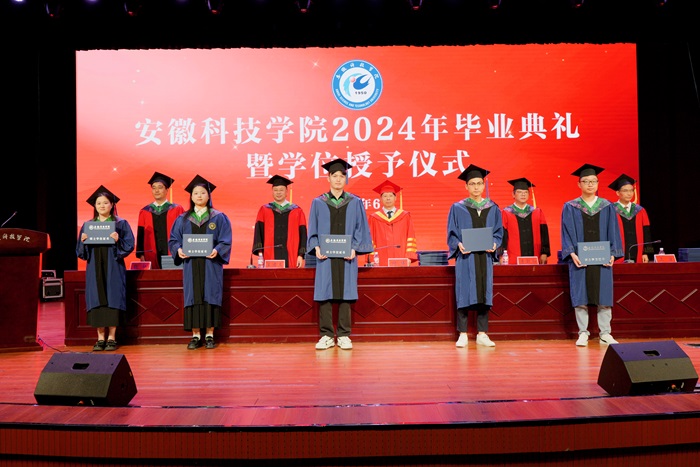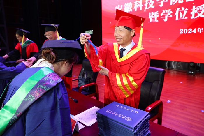 典礼上,学校精心打造的艺术思政课《安科有你》为2024届毕业生献上精彩的“最后一课”。围绕“匆匆那年”“年少的你”“是老师是学生”“安科有你”四个主题,以00后毕业生喜闻乐见的方式,精心策划编排,师生同台倾情演绎,回顾再现安科学子在校学习、生活、成长成才经历。本科毕业生代表何依和研究生代表江飞以互动分享的形式讲述自己成长成才经历,表达对母校、对老师、对同学的深厚情谊。教师代表、马克思主义学院思政课教师把安丹,研究生导师代表、农学院教授、博士李杰勤,毕业班辅导员代表、动物科学学院辅导员李焱,学校管理服务工作人员代表、龙湖校区公寓楼宿管阿姨路云侠集体出场,以深情朗诵寄语全体毕业生,送上学校老师和工作人员的谆谆教诲和美好祝愿。在骄傲、励志、感动、温馨、惜别的氛围中,下课铃声响起,在校学生带来一曲合唱《再见》,挥手深情送别学长学姐。
