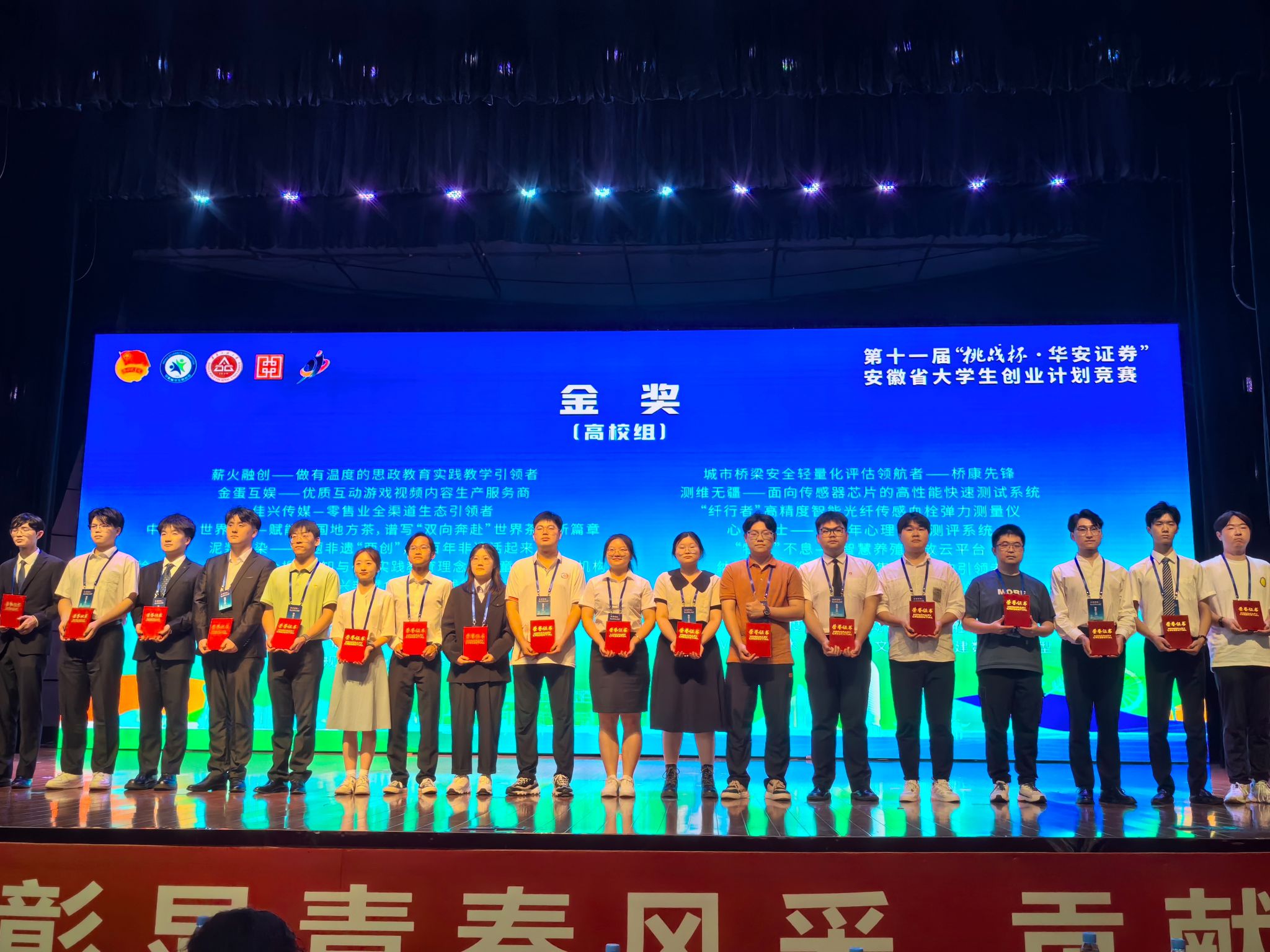 青春筑梦,科创报国。6月20日下午,由团省委、省教育厅、省科协、省社科院、省学联共同举办的第十一届“挑战杯·华安证券”安徽省大学生创业计划竞赛决赛在芜湖安徽工程大学胜利闭幕。我校9支队伍在380支决赛团队中突出重围,获金奖2项,银奖7项,学校荣获“优秀组织奖”。