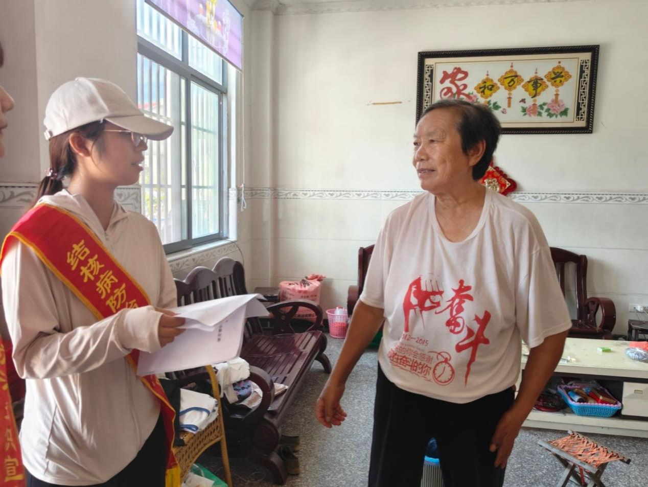 “夏乡之源”团队来到码头村村委会细分活动内容后,在村委会协助下有序开展实践活动。在前往村民家进行宣传的过程中,村容村貌让团队成员耳目一新,乡村振兴战略促使政府加大对农村基础设施建设的投入,农村居民的生活条件得到显著改善。队员们挨户访查,发现村民大多数是老年人,更加细致地为老人们讲述肺结核的主要症状,预防措施以及急救方法,嘱咐爷爷奶奶多开窗透气,保持空气清新,均衡饮食,高温天气预防中暑,与他们唠起了家常,了解他们对现在乡村振兴工作的认识与期待。“美丽乡村建设,山沟里长出美丽村庄”,村民们对乡村振兴战略给予了高度肯定,话里话外满满的自豪感。