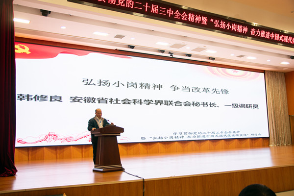 韩修良围绕“弘扬小岗精神 争当改革先锋”做主旨报告。他指出,全面深化改革迫切需要弘扬小岗精神,拿出更大的政治勇气和智慧,更有力的措施和办法;发展出题目,改革做文章,进一步全面深化改革要突出问题导向。中国特色社会主义制度是一个严密完整的科学制度体系,全面深化改革必须以制度建设为主线;深刻把握全面深化改革的牵引、出发点和落脚点。争当先锋要有明确的行动路径。