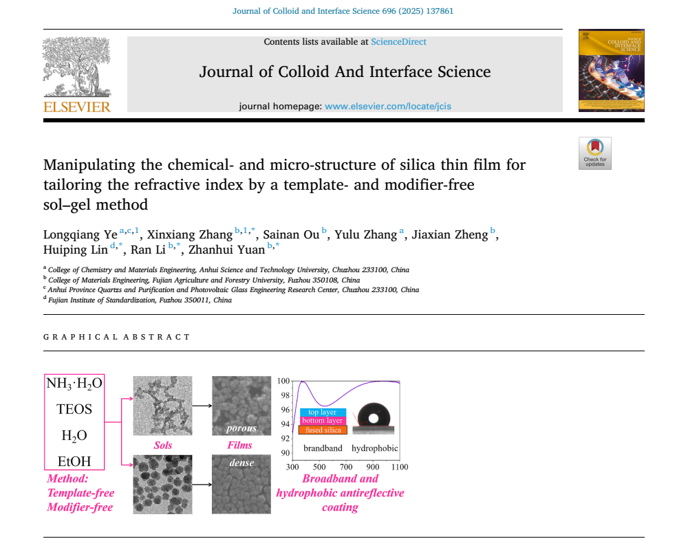 近日,我校化学与材料工程学院硅基新材料团队联合福建农林大学等单位在胶体与界面科学领域顶级期刊《Journal of Colloid and Interface Science》(中国科学院1区期刊,IF=9.4)发表了题为“Manipulating the chemical- and micro-structure of silica thin film for tailoring the refractive index by a template- and modifier-free sol-gel method”的研究论文。
