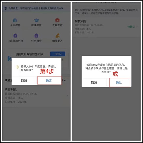 ② 依据提示“将带入2021年度信息,确认是否继续?”或者“您在2022年度已存在专项附加扣除信息。如果继续确认,将覆盖已存在的专项附加扣除信息!”,确认后点击确定。