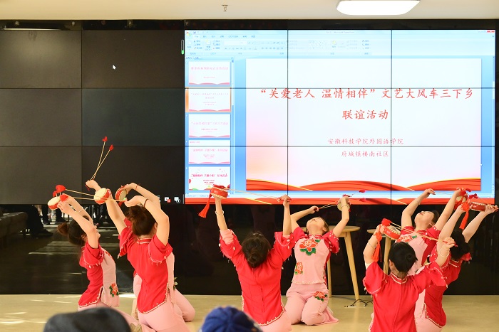 文艺汇演分为“春光无限,国盛人和”“千古传承,万世流芳”“日月昌明,松鹤长春”三个篇章,包含戏曲、歌曲、朗诵、器乐、花鼓、舞蹈、民谣等表演形式。文艺汇演在一曲《我和我的祖国》的婉转歌声中拉开序幕,来自安徽科技学院歌手协会的大学生用自己的方式表达了对祖国母亲的热爱;随后,同学们表演了《春三月》《春风十万里》等优美的舞蹈,让老人们感受到春天的气息和对美好生活的向往;《我爱这蓝色的海》《赛马》《月亮代表我的心》分别用口琴和二胡等乐器,让老人们在器乐表演中感受到海的广阔、夜的宁静和生命的伟大;黄梅戏《女驸马》的经典唱段让老人们听得津津有味;一出《鼓乡情怀》展现了凤阳本地特色的传统文艺。最后,全体演员献唱《祝你平安》为老人们送上最真挚的祝福。整场汇演主题鲜明,内容丰富,演员们用真挚的情感和精湛的表演赢得在场观众和老人的一致认可,现场掌声不断。文艺汇演结束后,学生党员分组到老人活动场所帮助老人整理被褥,打扫卫生,陪伴老人度过一个愉悦、温馨的下午。