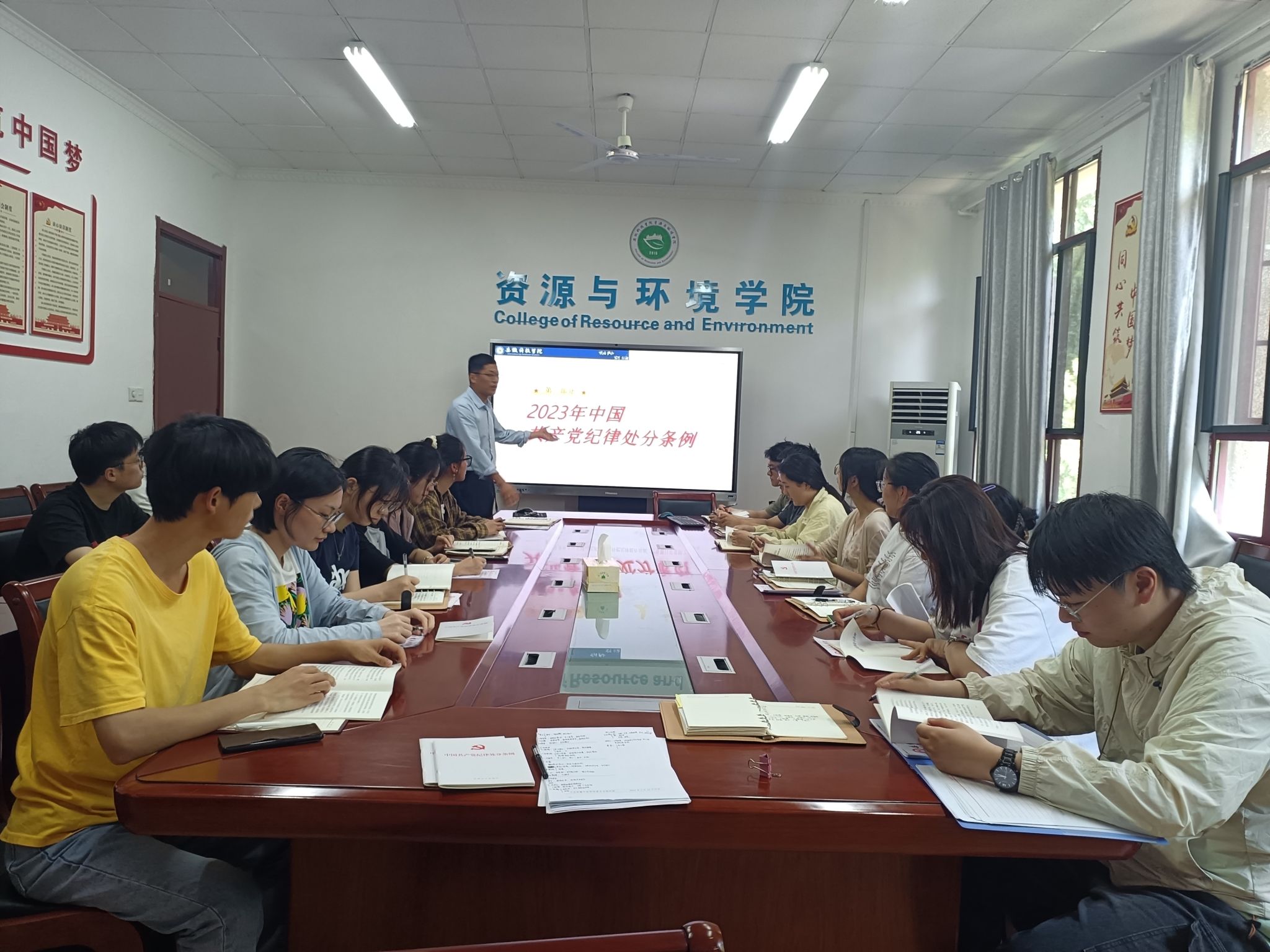 为进一步教育引导党员强化纪律意识,严守纪律规矩,发挥先锋模范作用。5月27日,资源与环境学院在学院会议室开展党纪学习教育专题党课。党课由学院党委副书记沈树周讲授。