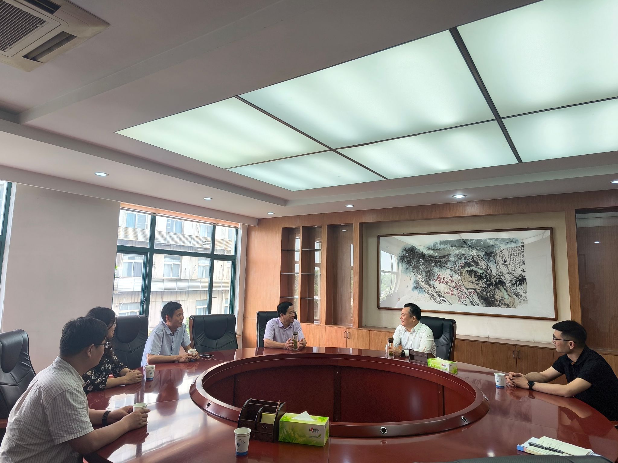 程启涛对程斌一行莅临淮南市经济技术开发区调研表示热烈欢迎,介绍了淮南市经济技术开发区的基本情况和重点发展领域。程斌介绍了学校和学院的基本情况,以及近年来在人才培养、学科建设和服务社会方面取得的发展成就。双方均表示淮南市经济技术开发区与安徽科技学院具有广阔的合作空间,为双方高质量发展将会注入新动力、培育新引擎。