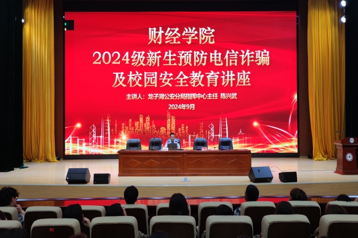为进一步提升学生的安全防范意识和自我保护能力,9月10日晚上,财经学院在东辅楼报告厅举办了预防电信诈骗及校园安全教育专题讲座。讲座由龙子湖公安分局指挥中心主任陈兴武主讲,财经学院党委副书记、纪委书记耿广汉主持,全体辅导员及2024级新生参加。